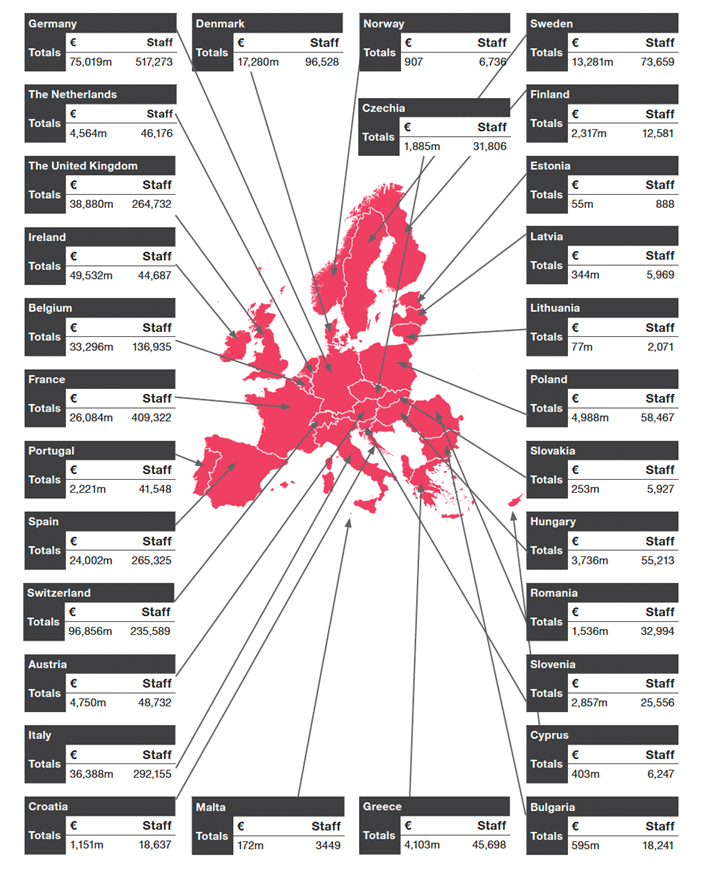 Podatki na sliki kažejo gospodarski vpliv in število zaposlenih za vsako državo članico.